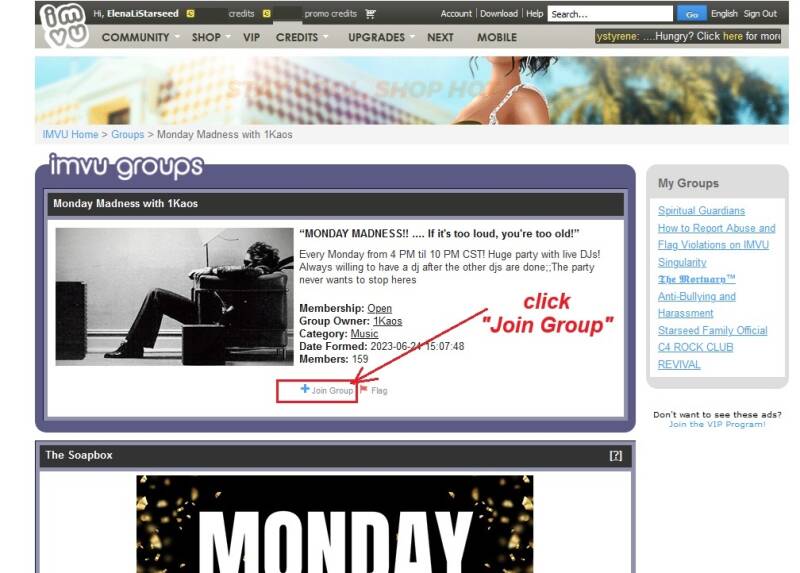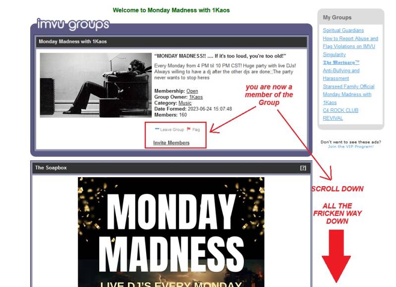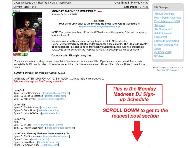 Follow the Pictorial Instructions below, which will show you how to go from the IMVU NEXT Website to the Monday Madness IMVU Group Page. It also shows you how to "Join" the Group, as well as how to go to the Monday Madness "Schedule" Discussion Post, and (finally) how to create a reply post to request a date and time slot for when you would like to DJ for Monday Madness.